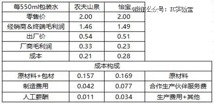 前面说到,怡宝和农夫山泉的物料成本,也就是水 瓶子的成本,每瓶大概是一毛六七的样子,水的成本都不到一分钱,也就是说,物料成本基本就是瓶子的成本。