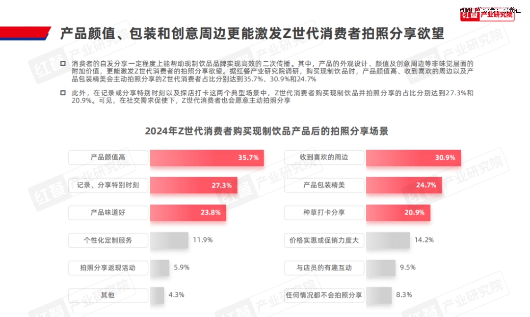 据红餐产业研究院调研,在记录或分享特别时刻以及探店打卡这两个典型场景中,Z世代消费者购买现制饮品并拍照分享的占比分别达到27.3%和20.9%。该机构还指出,消费者的自发分享一定程度上能帮助现制饮品品牌实现高效的二次传播。