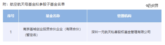 投资界-解码LP获悉,近日,南京市创投集团发布公告,公示了南京市航空航天母基金子基金遴选结果,母基金拟参股一支子基金——南京荟城创业投资合伙企业(有限合伙)(暂定名),管理机构为深圳一元航天私募股权基金管理有限公司(简称:一元航天),基金目标规模2亿元,拟注册落地南京市浦口区,存续期7年,主要投资航空航天、高端装备制造及相关产业链(装备、材料、元器件、核心零部件、配套服务等产业)。