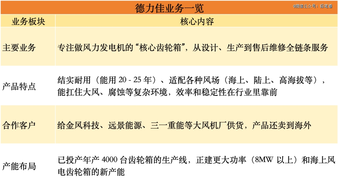 德力佳做的是风电机组的“心脏”——主齿轮箱,把风叶带动的低速旋转,转成发电机需要的高速旋转。客户主要是风电整机厂商,公司靠卖齿轮箱赚钱。