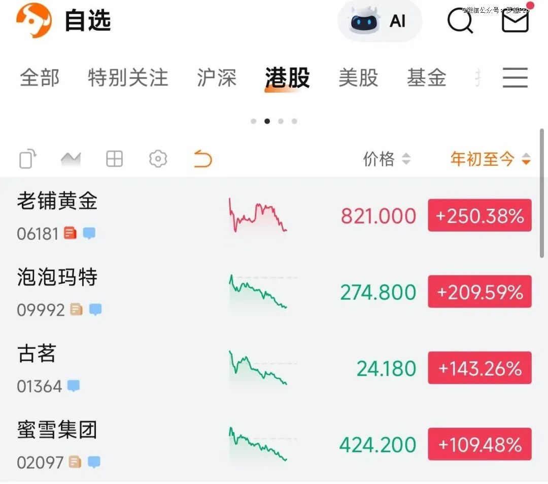 三季度已结束。我的富途App显示,25年至今股价涨幅最高的板块并不是AI,而是大消费:老铺黄金、泡泡玛特、古茗、蜜雪集团涨幅分别达250%、209%、143%、109%,跑赢了英伟达等AI明星股。