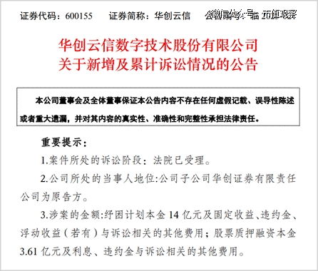 8月15日,华创云信发布公告,子公司华创证券诉贵州百灵大股东姜伟及其一致行动人的纾困计划及股票质押纠纷案,已收到当地法院案件受理通知。
