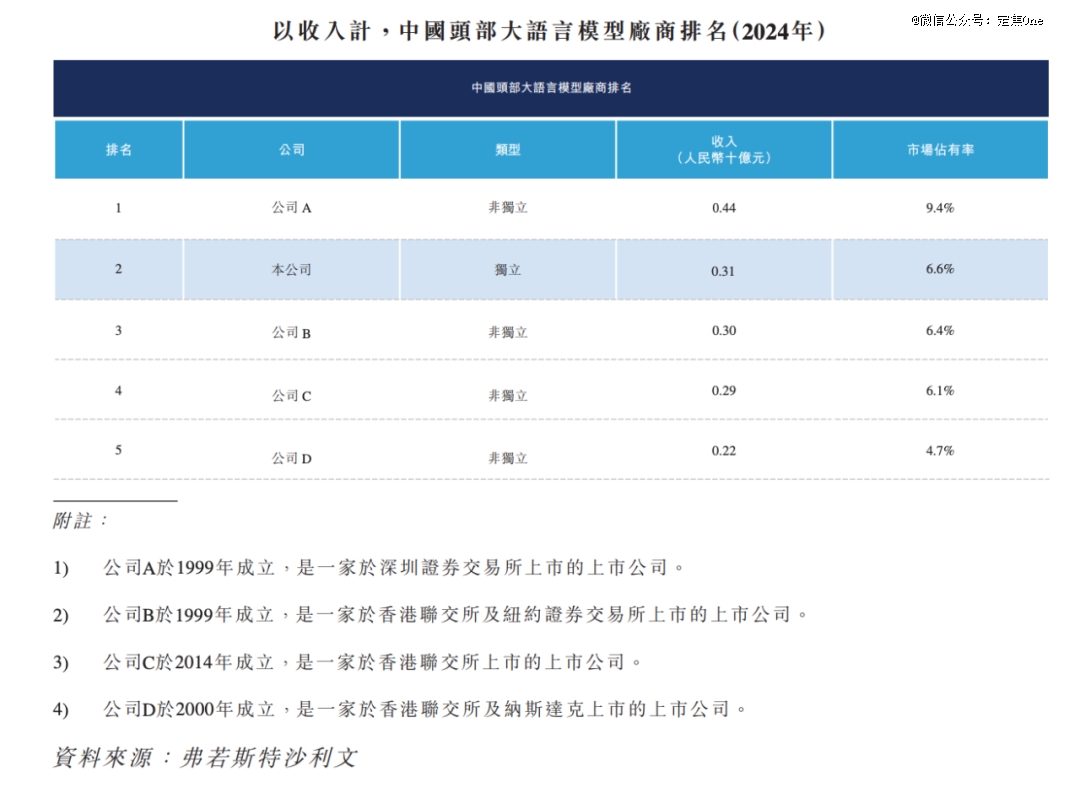 智谱AI在招股书中援引了咨询公司弗若斯特沙利文出具的一份榜单:按2024年收入,智谱AI以3.1亿元的收入、6.6%的份额,位列中国大模型厂商第二,仅次于科大讯飞,力压阿里、百度(公司名称根据招股书推断)。按此报告,智谱AI是中国*的独立大模型厂商。